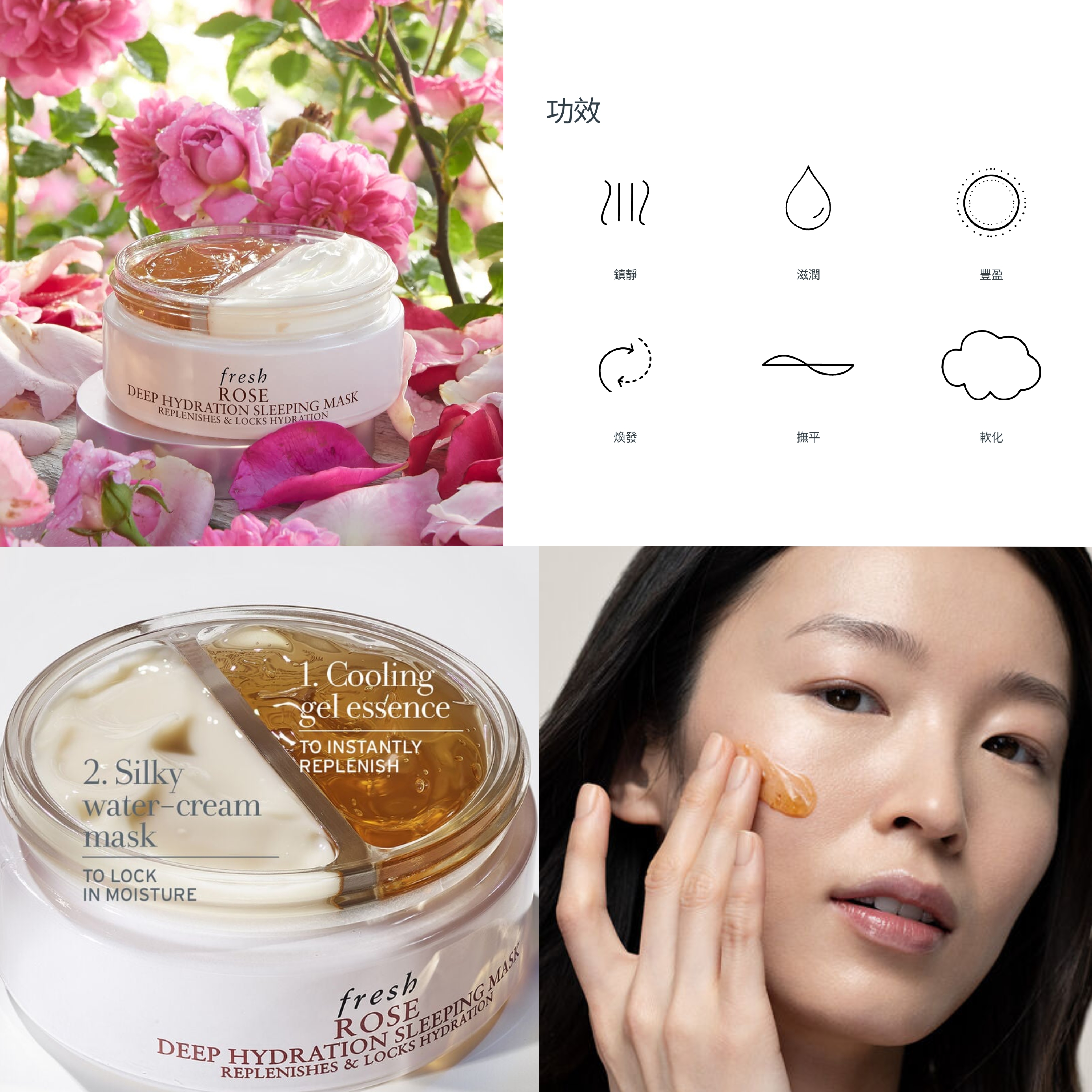 一向重視天然純淨的Fresh帶大家一起發現「美容覺」的奧秘,推出的玫瑰深層保濕睡眠面膜,這個兩步修護面膜既可即時補充肌膚於日間流失的水分,同時徹夜把水分好好鎖住。革命性先補水後鎖水科技,讓肌膚在晚間修護的黃金時間獲得深層滋潤補濕,翌晨醒來如花瓣般柔軟潤澤