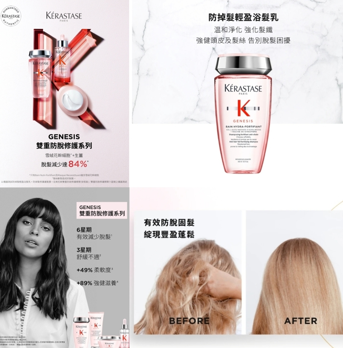 掉髮素來都是一個令人相當困擾的煩惱,除了每天梳洗頭髮拉扯,如家族遺傳、工作壓力、過度疲勞、女性分泌失調等等都是造成掉髮的主要原因。擁有一把豐盈濃密秀髮才是保持年輕的關鍵! KÉRASTASE防掉髮輕盈浴髮乳,為脆弱易斷發質而設的防掉髮洗髮水,主要透過多種活性成分,去解決髮絲斷裂或毛囊問題造成的脫髮, 6星期減少84%掉髮,輕鬆打造豐盈、亮澤及柔順的完美秀髮。